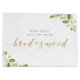 Custom-designed "Will You Be My Bridesmaid" gift bag for bridesmaid proposal gifts featuring gold calligraphy with watercolor greenery design.