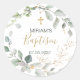 Baby Baptism/Christening Round Sticker. This design features an illustration of green and golden foliage in watercolor style.