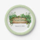 Celebrate your St. Patrick's Day Irish wedding with a touch of vintage charm using this unique paper plate. The design showcases a wooden frame adorned with lush greenery, creating a delightful backdrop for the couple's names written in a beautiful Celtic font. Adding to its appeal, the plate features a round border made of a striped pattern in a soft shade of green, giving it a stylish twist. While it deviates from the traditional clover motif, the combination of vibrant greenery and elegant Celtic typography makes this plate a stunning choice for your special day.