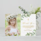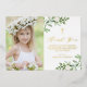 Send thanks to family and friends with this customisable first holy communion thank you card. It features watercolour greenery and white flowers. Personalise by adding your details. This gold foil photo first communion thank you card is perfect for autumn first communions.
