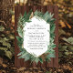 This rustic wedding invitation features a lush wreath of green leaves set against a warm, wooden background. The elegant serif font within the off-white central frame adds a touch of sophistication, making this design perfect for a nature-inspired wedding. The earthy tones and organic elements create a serene and inviting atmosphere, ideal for couples who love the beauty of the outdoors.