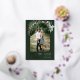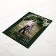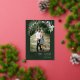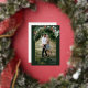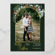 This design features watercolor holly and eucalyptus around an arched picture with a gold foil frame.