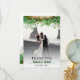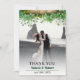 This rustic wedding thank you card features a vintage style design with a combination of wood and greenery, perfect for a spring wedding. The upper part of the card showcases a beautiful arrangement of wood and greenery, while the centre features a lovely photo of the couple. The phrase 'Thank You' is prominently displayed beneath the photo, adding a heartfelt touch to the card. Turning the card over, you'll find a continuation of the greenery theme at the bottom, tying the design together seamlessly.