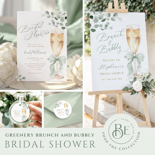This elegant Brunch and Bubbly Bridal Shower Invitation features soft watercolor greenery, eucalyptus foliage, and a delicate coquette green bow for a fresh and romantic look.