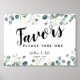 Enhance your wedding reception with The Arty Apples' "Favours Please Take One" sign. Featuring a delicate botanical eucalyptus design, this sign is both stylish and functional. Perfect for guiding guests to enjoy their wedding favours, it adds a touch of elegance to your special day.