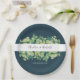 Fresh green eucalyptus leaves frame your names set in elegant typography with your special date set in a classic text on this modern country wedding themed paper plate. Designed by Thisisnotme©