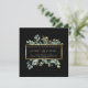 This beautiful elegant holiday wedding invitation features a classic gold geometric frame with greenery eucalyptus. Christmas greenery on a modern black background. Perfect design for your winter wedding.