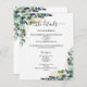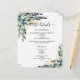A modern, elegant wedding details/program/timeline. A white background decorated with eucalyptus greenery and golden foliage. Personalise and add your names and wedding details. Black coloured letters.