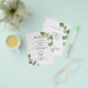 A modern, elegant wedding details/program/timeline. A white background decorated with eucalyptus greenery, sprigs. Personalise and add your names and wedding details. Black coloured letters.