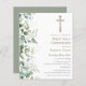 Looking for the perfect way to invite your family and friends to your child's First Holy Communion? Look no further than our customisable First Holy Communion paper invitation! Featuring an ornate gold-tone crucifix and a lush eucalyptus greenery border on a white background, this invitation is sure to impress your guests and set the tone for a beautiful and meaningful celebration.