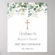 Celebrate your child's First Holy Communion in style with our customisable Welcome Poster Sign! Featuring a gold-coloured crucifix and delicate eucalyptus leaves on a pure white background, this poster is the perfect way to welcome your guests to your child's special event.