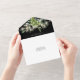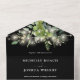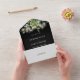 This all-in-one wedding invitation features pretty string lights and botanical greenery falling across elegant typography on a black background. The invitation includes a perforated RSVP card with your wedding website QR code and details. Designed by Thisisnotme©
