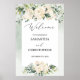 This is wedding welcome sign poster large format in boho style features greenery foliage with eucalyptus and white roses florals accented gold sparkles. See full collection with this design.