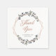 These trendy and elegant wedding napkins feature a faux rose gold geometric shape surrounded by beautiful greenery branches, with stylish faux rose gold script typography that says "thank you."