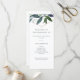 This trendy and elegant wedding program features a faux rose gold geometric shape surrounded by beautiful greenery branches.