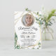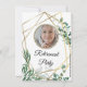 Greenery Geometric golden lines with eucalyptus in the background. The design is so elegant and modern that features a Golden and Bluish accent style with gold lines that complement the design. Also, there is a chic frame of beads where you can add your photo to make the invitation extra special and customisable.