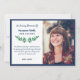 In loving memory announcement you can personalise with a photo. The announcement card features a blue border framing the photo and your text, and two crossed greenery twigs.