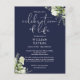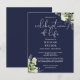 An elegant navy blue, botanical personalized watercolor greenery celebration of life remembrance invitation postcard. Designed by Thisisnotme©