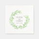 A contemporary wedding paper napkin featuring an open watercolor laurel wreath in delicate green hues. The floral greenery is a versatile choice that coordinates with any colour scheme you plan for your special day. Enter your details in place of the sample text shown.