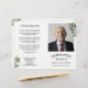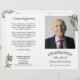 Greenery funeral program in white with greenery adorning the white pages. White and green greenery funeral program personalised with a photo. Write obituary, order of service, and acknowledgements.