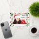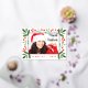 The placeholder photo is in a gold foil frame. On it, the greeting "Merriest Christmas" is written in a modern handwriting script, also in gold foil. Around the frame, there is greenery and red berries, painted in watercolor. Under the frame, the name and year are written in red.