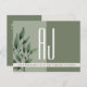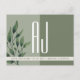 Rustic, elegant, simple, contemporary typography sage green wedding save the date announcement postcard, with giant monogram initials at the front, watercolor greenery and modern calligraphy.