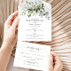 This greenery script wedding all in one invitation is perfect for a minimalist wedding. Modern and straightforward handwritten calligraphy lettering paired with a classic italic-serif font. Customizable in any color. Keep the design minimal and simplistic, as is, or personalize it by adding your graphics and artwork. Just handwrite your guest addresses on the back of the folded invitation, or purchase the coordinating guest address label stickers (sold separately).