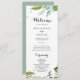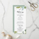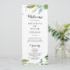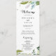 This greenery tropical calligraphy wedding program is perfect for a simple wedding. The design features predominantly green tropical leaves with a touch of pink blush flowers neatly arranged into elegant wreaths and geometric shapes.