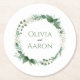 Add a refined and personalized touch to your reception with this elegant greenery wedding coaster. Featuring a soft botanical wreath of eucalyptus, ferns, and delicate foliage, this circular design beautifully frames your names in a clean, modern type style. The airy greenery and subtle sage tones create a timeless, romantic look that complements garden, outdoor, and classic wedding themes. Perfect for place settings, cocktail hour, or bar decor, this coaster doubles as both a functional detail and a meaningful keepsake for guests. Easily customize with your names or special wording to match your wedding aesthetic.