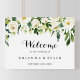 This greenery white autumn floral wedding welcome sign is perfect for a rustic wedding. The design features elegant watercolor white peonies with green foliage. Make this poster your own by adding the name of the bride and groom, and the date of the wedding.