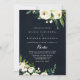 This greenery white floral royal blue Spanish wedding invitation is perfect for a rustic wedding. The design features elegant watercolor white peonies with green foliage in a dark blue background.