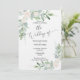 This watercolor design is completely editable and ready for you to enter your information. The florals are a white blush colour tucked in with eucalyptus boxwood and ferns. Customise the shape of the paper, type of paper and all text.