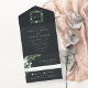 Our Greenhouse wedding invitation frames your initials with an elegant square border of lush green foliage, botanical leaves, and tiny white flowers. Personalise with your wedding details in classic lettering with a chic calligraphy script accent. A rich, inky off-black background provides a striking backdrop for your ceremony details. Attached RSVP card and folding style makes this all-in-one invitation an appealing choice. A beautiful choice for summer evening weddings, fall or autumn nuptials, or snowy winter weddings.