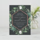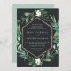 Choose these richly coloured botanical wedding invitations for elegant winter weddings, fall or autumn nuptials, or evening weddings in the summer. Chic design combines natural and geometric elements for a fresh and modern look. Your wedding details appear in white lettering, framed by a faux copper foil border and surrounded by green foliage, lush leaves, and small white flowers on a rich off-black background. Matching items available in our Greenhouse collection.