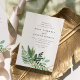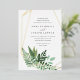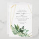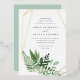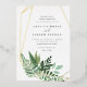 Choose these richly coloured botanical wedding invitations for elegant winter weddings, fall or autumn nuptials, or evening weddings in the summer. Chic modern design combines natural and geometric elements for a fresh and eyecatching look. Your wedding details appear in inky off-black lettering, framed by a gold foil border accented by green foliage, lush leaves, and small white flowers at the lower left corner, on a crisp white background. Matching items available in our Greenhouse collection.