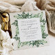 Choose these richly colored botanical wedding invitations for elegant winter weddings, fall or autumn nuptials, or evening weddings in the summer. Chic square design combines natural and geometric elements for a fresh and modern look. Your wedding details appear in rich off-black lettering on a crisp white center square, framed by green foliage, lush leaves, and small white flowers. A warm cream ivory background adds softness and texture. Matching items available in our Greenhouse collection.