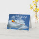 Diamond kite in four colors, with long tail, flying against blue sky and white clouds. Red, Yellow, green and blue kite on blue envelope. See matching envelope in coordinate set bkm3p.
