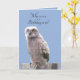 Owlet sitting on fence "Who - o - o - s Birthday is it?" on front. Inside "It's Your Birthday! Have a Great Day." on inside with text above head of owl with pale blue background. Inside text may be customised.