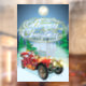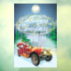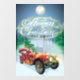 Santa Claus drives a vintage car with gifts through the winter forest at night