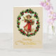 This gorgeous customisable holiday design features a beige card with golden typography that reads "Greetings at Christmas" and a cute Victorian girl, dressed in red and white walking through a snowy meadow.