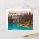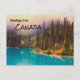 A postcard with a photograph with a scenic northern landscape photograph. A turquoise coloured lake with a forest of pine trees in the background and a foggy misty sky giving it a magical mystical quality. Text reads: Greetings from Canada.