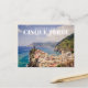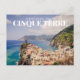 Share the beauty and charm of Vernazza, one of the five colourful towns of Cinque Terre, with this stunning postcard. The photograph captures a clear day with sparkling blue waters and a lush green hillside, complemented by the distinctive pink buildings adding a pop of colour. The front of the postcard reads "Greetings from Cinque Terre," while the back is left blank for your personal message. This postcard is a perfect way to share your love for Italy and the beauty of its coastal towns.