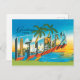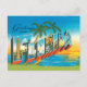 Vintage Greetings from Florida postcard reproduction with filled letters, a sunset on the water, and palm trees. The letters of Florida are filled with Florida scenes including sailboats, pelican, fish, and oranges. Beautiful piece of old florida history.