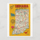 This is a reproduction of a vintage "Greetings from Indiana, the Hoosier State" postcard featuring a map of the state and its flag, seal, state flower, and state bird.
