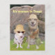 Customisable postcard to joke about the heat. Moses and Myrtie are in safari hats with canteens. You can customise the text on the front. The rock in the background is from a picture on PublicDomainPictures.net.