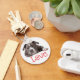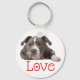 This fun canine keychain features a grey and white American Staffordshire Terrier pup highlighted against a creamy white background with love printed in a bold red heart font.