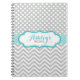 Cute personalised notebook with a pretty light grey, mint green and aqua blue polka dot and chevron pattern design.