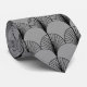 This necktie has an art deco design of black fans repeating across the design on a field of grey.