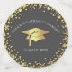 This modern design features a graduation hat and confetti in gold on a background of grey with white text.