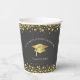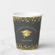 This modern design features a graduation hat and confetti in gold on a background of grey with white text.